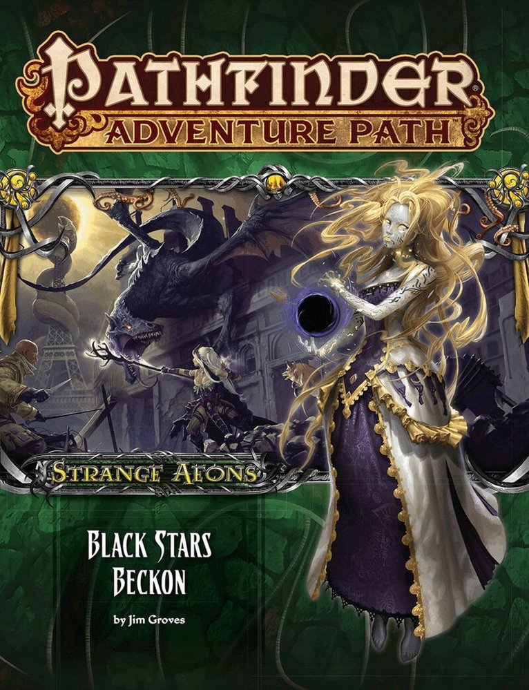 The Strange Aeons Adventure Path draws to a stunning conclusion! Arriving in the alien city of Carcosa, the adventurers must sever the links that bind Carcosa to Golarion. In wandering the parasitic city the characters navigate the frozen ruins of an elder thing city, deal with accursed partygoers in a reflection of an Azlanti city, and encounter a mute musician who can help them find their way in the maddening streets of lost Carcosa. Can the heroes keep Carcosa from drawing Thrushmoor into its amalgam of stolen cities or do they risk waking the unspeakable nightmare that stirs in the depths of Lake Hali? They must break these links—or Golarion is doomed to greet the King in Yellow.“Black Stars Beckon” is a Pathfinder Roleplaying Game adventure for 15th-level characters. The adventure continues the Strange Aeons Adventure Path, a twisted delve into madness that pits the heroes against the cosmic horrors of the Cthulhu Mythos. A selection of new monsters, a look into the past of Golarion, ideas for further adventures beyond the bounds of the Strange Aeons campaign, and the final installment of a new Pathfinder’s Journal round out this volume of the Pathfinder Adventure Path.Each monthly full-color softcover Pathfinder Adventure Path volume contains an in-depth adventure scenario, stats for several new monsters, and support articles meant to give Game Masters additional material to expand their campaign. Pathfinder Adventure Path volumes use the Open Game License and work with both the Pathfinder RPG and the world’s oldest fantasy RPG.