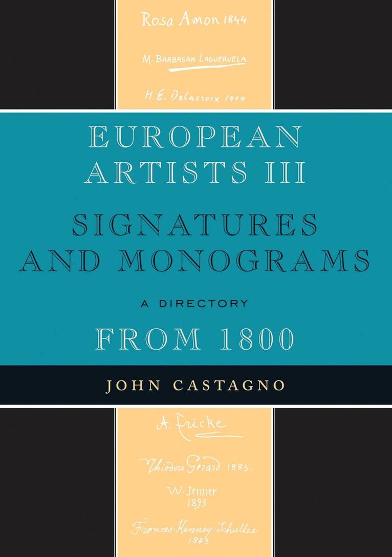 John Castagno's Artists' Signatures and Monograms have become the standard reference source for galleries, museums, libraries, and collectors around the world. Whether used to identify, authenticate, or verify signatures and works of both well-known and little-known artists, Castagno's work has no equal.In the first volume of European Artists Signatures and Monograms, 1800-1990 (Scarecrow, 1990), Castagno provided identification for more than 4,800 artists' signatures, along with biographical information and reference sources. The second volume, published by Scarecrow in 2007, identified an additional 2,100 artists and featured 3,000 signature examples. This third volume features an additional 2,800 artists and signatures. In addition to the standard signature entries, the book features sections for monograms and initials, common surname signatures, alternative surname signatures, and illegible signatures. Less than five percent of the entries in this volume are listed in the original volumes—and these are included to provide additional information about the artists.The use of European Artists III: Signatures and Monograms From 1800, A Directory provides the researcher a reference tool not duplicated elsewhere—one that will save many hours of research.