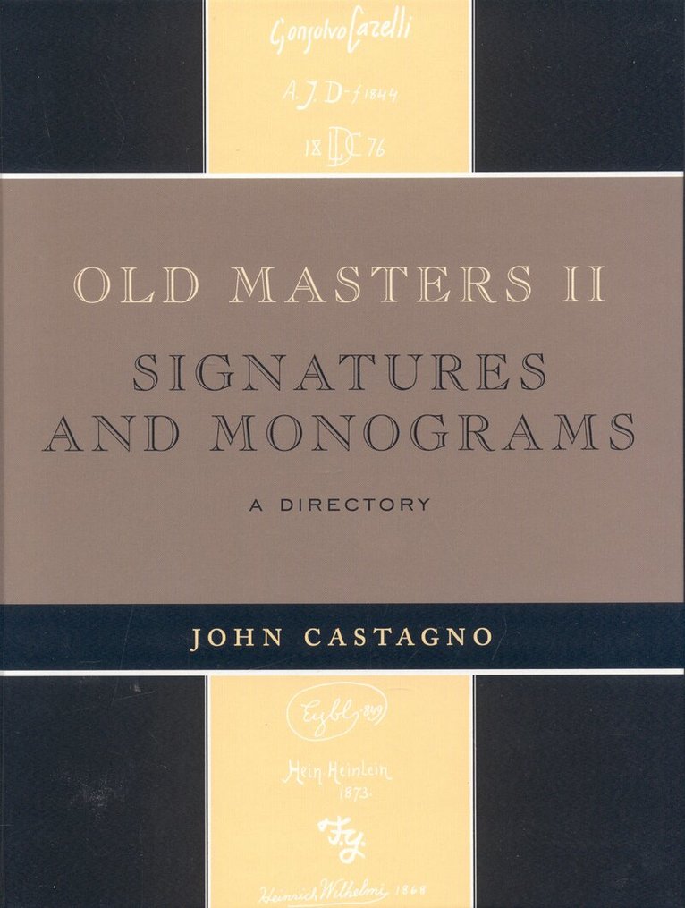 John Castagno's Artists' Signatures and Monograms have become the standard reference source for galleries, museums, libraries, and collectors around the world. Whether used to identify, authenticate, or verify signatures and works of both well-known and little-known artists, Castagno's work has no equal.In the first volume, Old Masters Signatures and Monograms, 1400-Born 1800, Castagno provided identification for some 2,700 signature examples of more than 1,700 artists. In this second volume, there are more than 800 artists listed, with more than 1,100 signature examples. In addition, this volume now treats artists from the early 19th century, thereby broadening the time period covered in the first volume.The use of Old Masters II: Signatures and Monograms, An International Directory provides the researcher a reference tool not duplicated elsewhere—one that will save many hours of research.