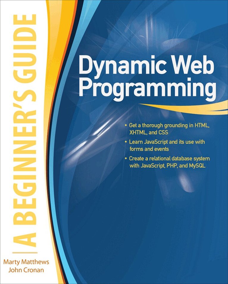 To create a dynamic page on which content changes in response to events requires programming and the potential use of databases. Dynamic Web Programming: A Beginner's Guide starts by covering HTML, XHTML, and CSS. You will then learn to use JavaScript to implement elements such as rollover events, popups, and calculations. The book explains how to use PHP to create guest books, blogs, and page transitions, as well as how to implement a database-driven Web site with MySQL.