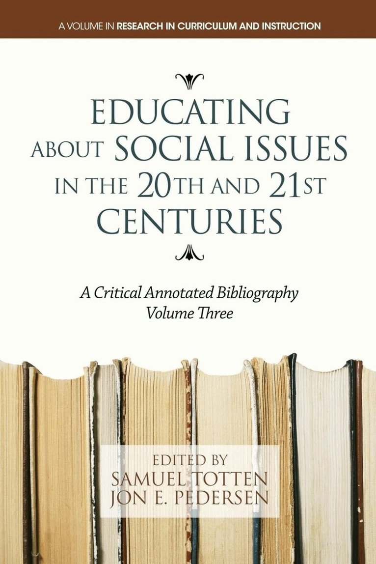 Educating about social issues in the 20th and 21st Centuries: A Critical Annotated Bibliography, Volume 3 is the third volume in a series that addresses an eclectic host of issues germane to teaching and learning about social issues at the secondary level of schooling, ranging over roughly a one hundred year period (between 1915 and 2013). Volume 3 specifically addresses how an examination of social issues can be incorporated into the extant curriculum. Experts in various areas each contribute a chapter in the book. Each chapter is comprised of a critical essay and an annotated bibliography of key works germane to the specific focus of the chapter.