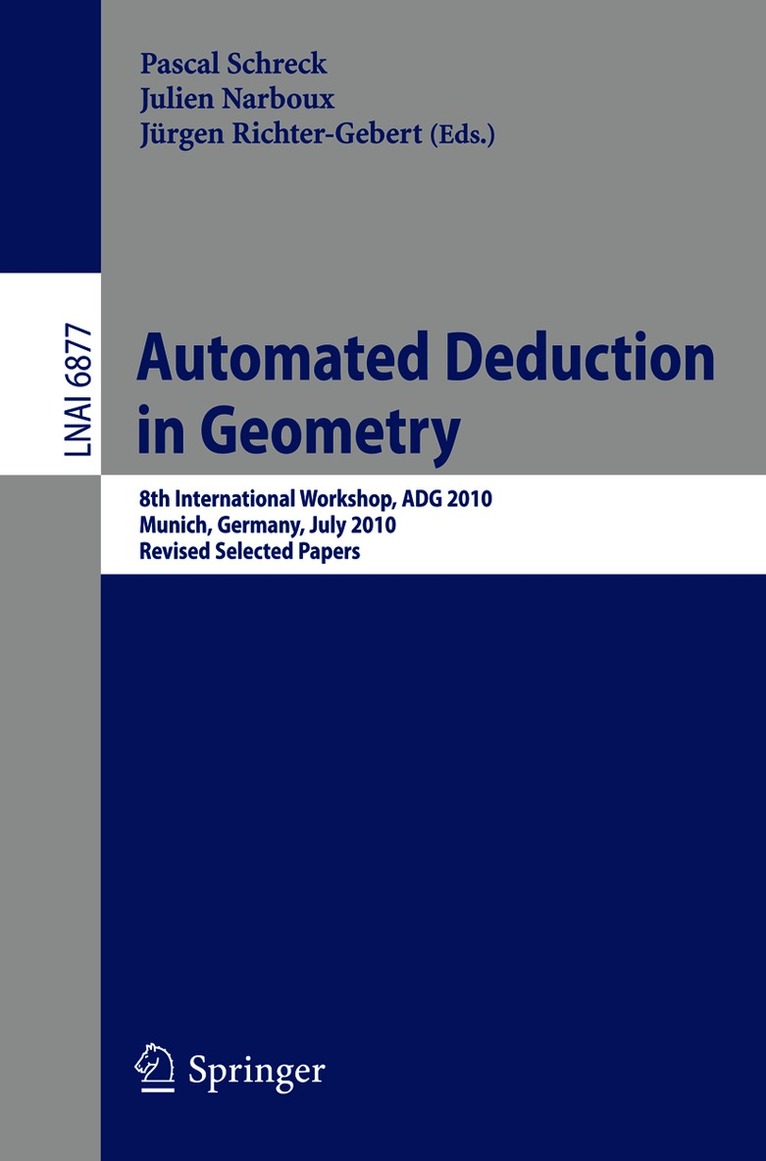 This book constitutes the thoroughly refereed post-workshop proceedings of the 8th International Workshop on Automated Deduction in Geometry, ADG 2010, held in Munich, Germany in July 2010. The 13 revised full papers presented were carefully selected during two rounds of reviewing and improvement from the lectures given at the workshop. Topics addressed by the papers are incidence geometry using some kind of combinatoric argument; computer algebra; software implementation; as well as logic and proof assistants.