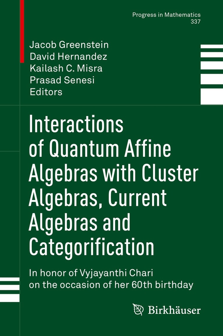 This volume collects chapters that examine representation theory as connected with affine Lie algebras and their quantum analogues, in celebration of the impact Vyjayanthi Chari has had on this area. The opening chapters are based on mini-courses given at the conference “Interactions of Quantum Affine Algebras with Cluster Algebras, Current Algebras and Categorification”, held on the occasion of Chari’s 60th birthday at the Catholic University of America in Washington D.C., June 2018. The chapters that follow present a broad view of the area, featuring surveys, original research, and an overview of Vyjayanthi Chari’s significant contributions. Written by distinguished experts in representation theory, a range of topics are covered, including:String diagrams and categorificationQuantum affine algebras and cluster algebrasSteinberg groups for Jordan pairsDynamical quantum determinants and PfaffiansInteractions of Quantum Affine Algebras with Cluster Algebras, Current Algebras and Categorification will be an ideal resource for researchers in the fields of representation theory and mathematical physics.