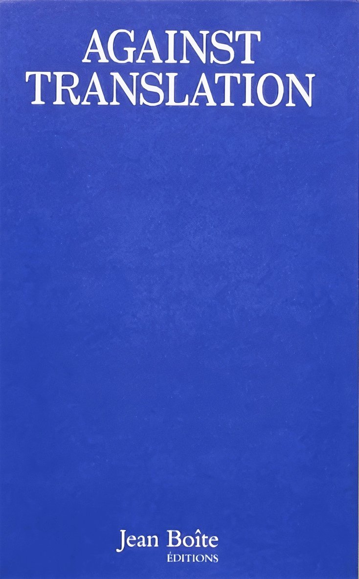 Against Translation is a text by American poet Kenneth Goldsmith (born 1961) published in eight volumes--English, French, Spanish, German, Chinese, Japanese, Russian and Arabic. The author discusses the impasses and shortcomings of translation and the virtues of an unapologetic linguistic “displacement. ” “Translation is the ultimate humanist gesture,” he states. “Polite and reasonable, it is an overly cautious bridge builder . in the end, it always fails, for the discourse it sets forth is inevitably off-register. ” Displacement, by contrast, never explains itself.