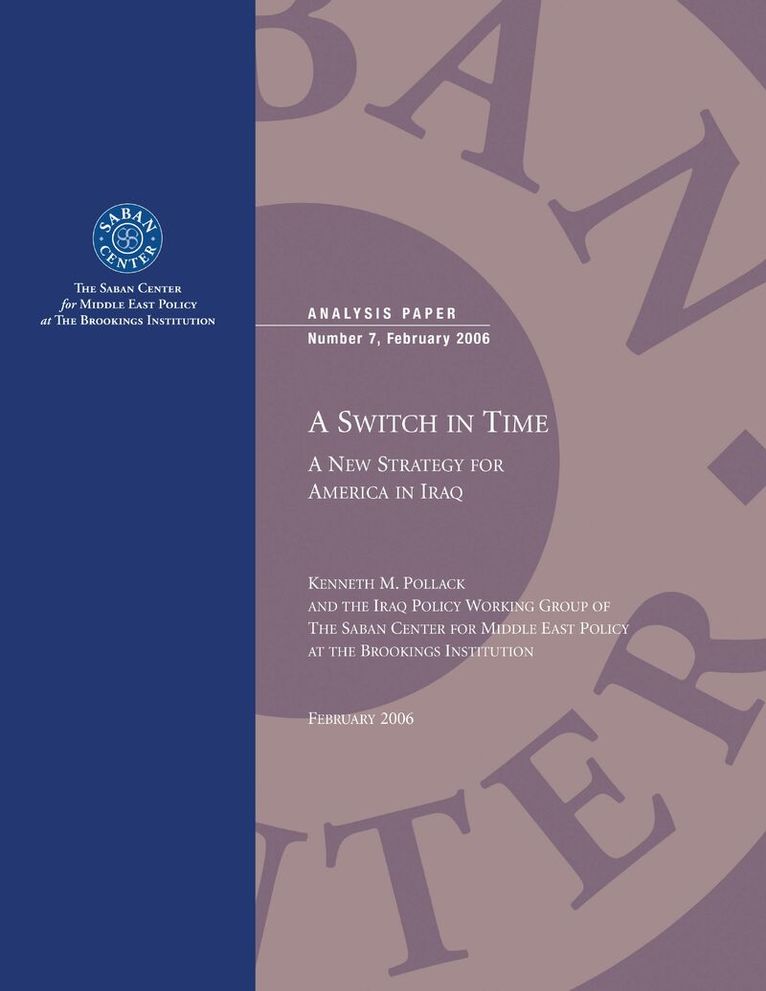 There is no greater foreign policy challenge for the United States today than the reconstruction of Iraq. The Saban Center for Middle East Policy at Brookings recently assembled a small group of experts to consider U.S. policy toward Iraq in all of its dimensionsmilitary, political, and economic. Saban Center director of research Ken Pollack took the recommendations of the Iraq Policy Working Group and combined them with findings from trips to Iraq and to U.S. Central Command in Tampa to produce A Switch in Time, a comprehensive strategy for stabilizing Iraq in the near term and setting it back on the path toward political and economic advancement. The current U.S. approach is encountering considerable difficulty and appears unlikely to produce a stable Iraq within the next few years, not only because of the military insurgency but also because of government failure in Iraq: the overthrown Saddam regime was not replaced by effective military or political institutions. The alternative proposed by some Bush administration critics, howevera rapid withdrawalwould not serve U.S. interests. While many thoughtful experts have attempted to offer a realistic third course of action, none has so far succeeded. This report proposes such a strategy by detailing the essential need to integrate military, political, and economic policies in Iraq. This concise and straightforward book offers a comprehensive, alternative approach to current U.S. military, political, and economic policies in Iraq. Iraq Policy Working Group: Raad Alkadiri (PFC Energy Consulting), Frederick Barton (Center for Strategic and International Studies), Daniel Byman (Saban Center and Georgetown University), Noah Feldman (New York University), Paul Hughes (United States Army [ret.], United States Institute of Peace), Brian Katulis (Center for American Progress), Andrew Krepinevich Jr. (United States Army [ret.], Center for Strategic and Budgetary Assessments),Andrew Parasiliti (Barbour, Griffith & Rogers), Kenneth M. Pollack (Saban Center), Irena Sargsyan (Saban Center), and Joseph Siegle (Development Alternatives)