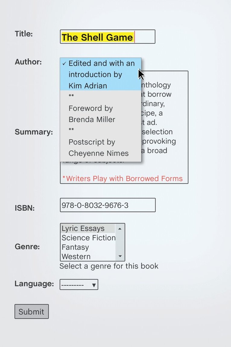 Within the recent explosion of creative nonfiction, a new type of form is quietly emerging, what Brenda Miller calls “hermit crab essays.” The Shell Game is an anthology of these intriguing essays that borrow their structures from ordinary, everyday sources: a recipe, a crossword puzzle, a Craig’s List ad. Like their zoological namesake, these essays do not simply wear their borrowed “shells” but inhabit them so perfectly that the borrowed structures are wholly integral rather than contrived, both shaping the work and illuminating and exemplifying its subject.The Shell Game contains a carefully chosen selection of beautifully written, thought-provoking hybrid essays tackling a broad range of subjects, including the secrets of the human genome, the intractable pain of growing up black in America, and the gorgeous glow residing at the edges of the autism spectrum. Surprising, delightful, and lyric, these essays are destined to become classics of this new and increasingly popular hybrid form.