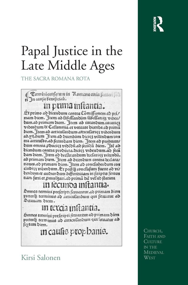 This is a study of the history and function of the highest ecclesiastical tribunal, the Sacra Romana Rota, from the twelfth to the sixteenth centuries. Despite its importance for Christendom and in contrast with other important papal offices, the activity of the Rota has never been thoroughly investigated on the basis of archival sources, in large part due to the vast source material and the perceived "difficulty" of the subject. This book fills this significant gap by explaining how the Rota functioned-its organization, the phases of a Rota process, everyday practices at the tribunal-and the kinds of issues it handled, where the processes originated from and how long they lasted. The study demonstrates that the Rota dealt with a range of cases much broader than has previously been acknowledged, whilst also confirming that the tribunal mainly oversaw litigation over benefices. The results of this research reveal the true role of the Rota and its significance for Christians from the middle ages to the dawn of the Reformation.