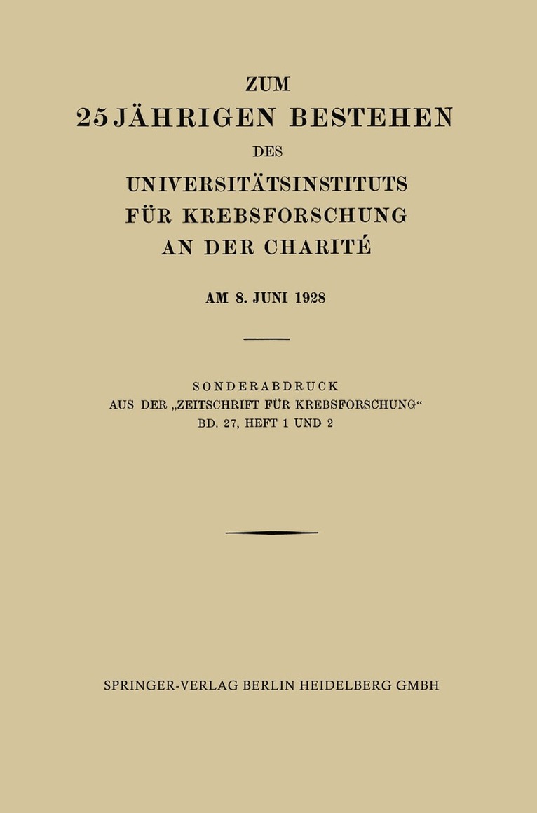 Zum 25 Jährigen Bestehen des Universitätsinstituts für Krebsforschung an der Charité am 8. Juni 1928