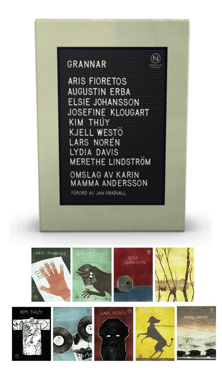 Böckerna är samlade i en fin presentbox och rymmer berättelser om samhörighet och främlingskap, där erfarenheter både kan föra oss samman och skilja oss åt. Alla är vi grannar med varandras liv.Boxen innehåller nio böcker: Aris Fioretos - Rapport från den täta världenAugustin Erba - HiwaElsie Johansson - Höra stenarna sjungaLars Norén - De sista rummenKim Thúy - HitomiMerethe Lindström - Ödelagda städerKjell Westö - Midsommar med herr LaaksoJosefine Klougart - RegnLydia Davis - Våra främlingar"Lyx. Att bara ta i de här nio små häftena och på varje titelsida få en nygjord bild av konstnären Karin Mamma Andersson, ett unikt träsnitt för varje bok, ger mig små stötar av estetisk vällust." Dagens Nyheter"Grannar är liksom den digra namnlistan på omslaget garanterar en samling högkvalitativa texter som visar på prosans mångfald."Sydsvenskan"Det är en gottepåse utan botten. Innehållet kan konsumeras gång på gång på gång. Petas ner i handväskan och plockas fram på bussen hem från jobbet. I dag, imorgon, närhelst det passar. Som en brustablett av litteratur som bara finns där, alltid redo. Så himla genialt."Skånska Dagbladet"Oftast läser man novellsamlingar där en författare skrivit alla noveller, men att läsa nio vitt skilda noveller var verkligen en upplevelse. Dessutom håller samtliga en hög kvalitet."Kommunalarbetaren"Tillsammans bildar de nio kloka och subtila bidragen en mångfacetterad, växelvis sorglig och rolig karta över grannlandskapets oundvikliga problem."Weekendavisen