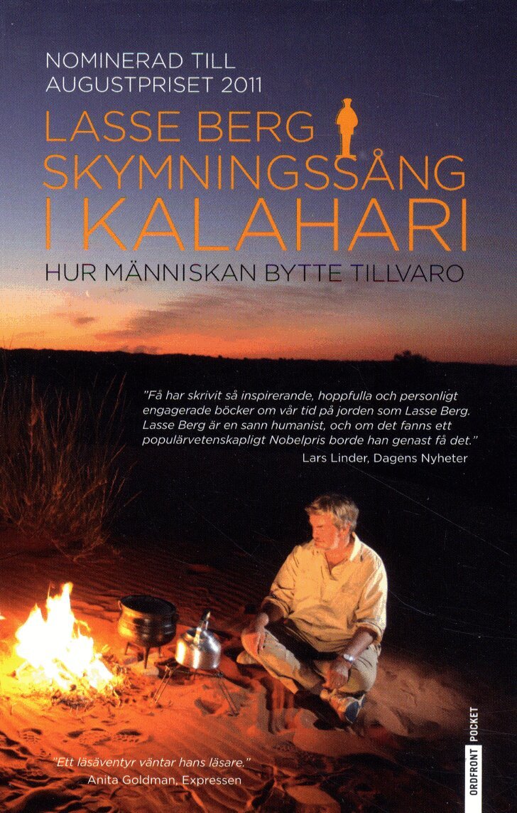 Skymningssång i Kalahari är världsresenären Lasse Bergs uppföljare till den prisbelönade och omtalade boken Gryning över Kalahari, hur människan blev människa. Vad kan berättelsen om Kain och Abel lära oss om människans djupa historia? Varför kan en dagistillvaro vara naturligare än hemmagosande för Homo sapiens barn? Varför tänker kommunalrådet i Vellinge som en bushman i Kalahari? Varför blev den högra stortån vanställd på alla kvinnor i människans första tätort?