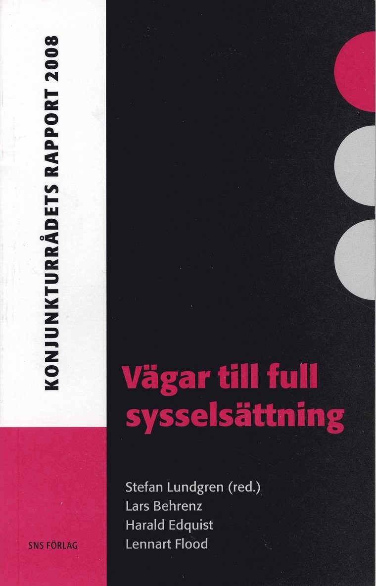 Full sysselsättning och en låg arbetslöshet har alltid varit viktiga mål för den ekonomiska politiken. 2008 års Konjunkturråd diskuterar vägar till full sysselsättning med utgångspunkt i de ekonomisk-politiska åtgärder som regeringen presenterat det gångna året. Åtgärderna syftar att varaktigt öka sysselsättningen, minska arbetslösheten och också minska antalet personer som försörjs av olika transfereringssystem. I Konjunkturrådets rapport analyseras vilka konsekvenser sysselsättningspolitiken kan förväntas ha för människors disponibla inkomster och arbetsutbud, om, och i så fall hur, ett högre arbetsutbud kan absorberas av en ökad arbetskraftsefterfrågan samt hur långt på vägen mot full sysselsättning de föreslagna åtgärderna kan förväntas leda. Rapporten diskuterar också arbetsrättens betydelse i detta sammanhang. SNS Konjunkturrådet 2008 består av Stefan Lundgren, docent i nationalekonom, vd för SNS och ordförande i Konjunkturrådet; Lars Behrenz, docent i nationalekonomi vid Växjö universitet; Harald Edquist, ekonomie doktor i ekonomisk historia och forskningsledare vid SNS och Lennart Flood, professor vid Handelshögskolan, Göteborgs universitet.