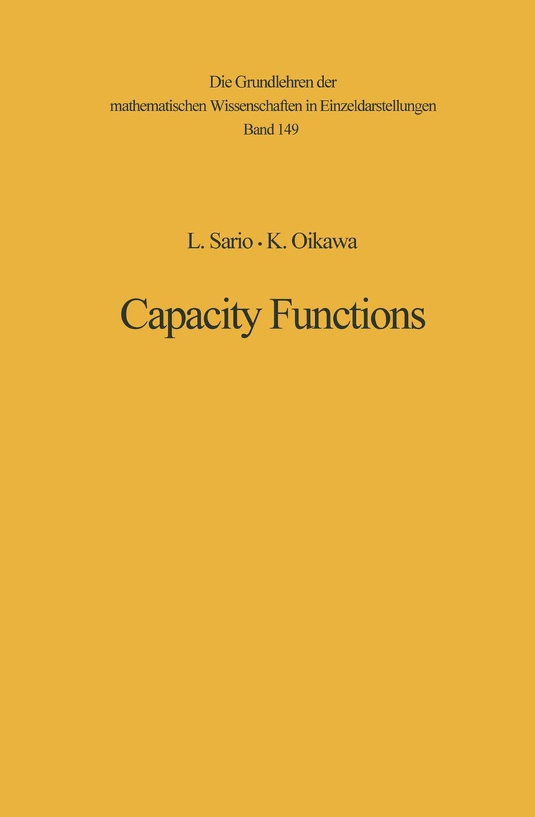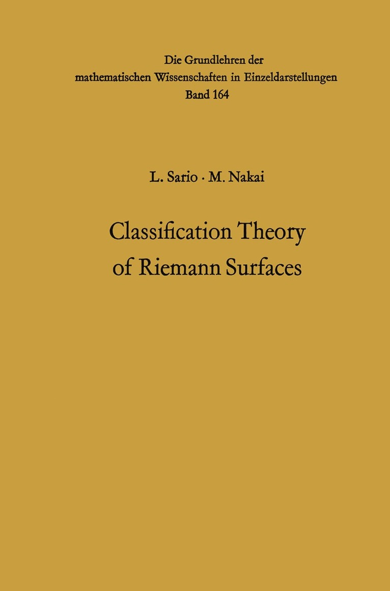 The purpose of the present monograph is to systematically develop a classification theory of Riemann surfaces. Some first steps will also be taken toward a classification of Riemannian spaces. Four phases can be distinguished in the chronological background: the type problem; general classification; compactifications; and extension to higher dimensions. The type problem evolved in the following somewhat overlapping steps: the Riemann mapping theorem, the classical type problem, and the existence of Green's functions. The Riemann mapping theorem laid the foundation to classification theory: there are only two conformal equivalence classes of (noncompact) simply connected regions. Over half a century of efforts by leading mathematicians went into giving a rigorous proof of the theorem: RIEMANN, WEIERSTRASS, SCHWARZ, NEUMANN, POINCARE, HILBERT, WEYL, COURANT, OSGOOD, KOEBE, CARATHEODORY, MONTEL. The classical type problem was to determine whether a given simply connected covering surface of the plane is conformally equivalent to the plane or the disko The problem was in the center of interest in the thirties and early forties, with AHLFORS, KAKUTANI, KOBAYASHI, P. MYRBERG, NEVANLINNA, SPEISER, TEICHMÜLLER and others obtaining incisive specific results. The main problem of finding necessary and sufficient conditions remains, however, unsolved.