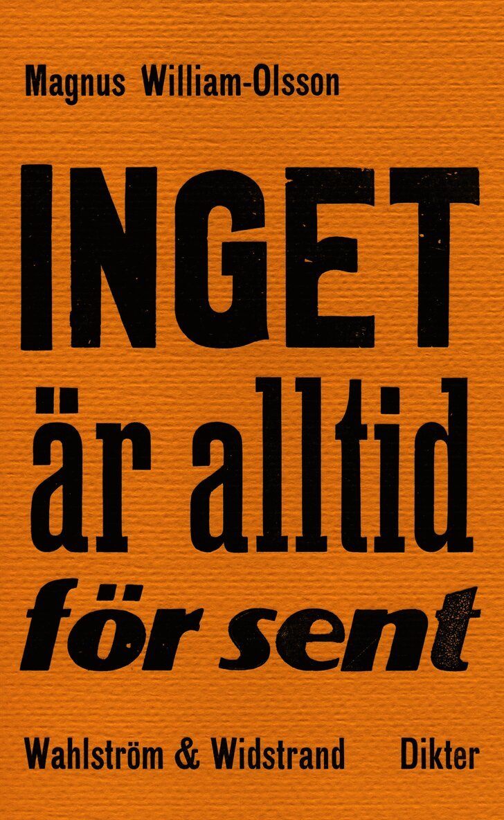 Dikterna i Magnus William-Olssons nya samling "Inget är alltid för sent" handlar om vår tid, om politik, sanning och frihet i de sociala mediernas, övervakningens och raseriets era. Men också om begär, åtrå och åldrande, om att leva med de redan döda och de ännu ofödda. Sapfos grekiska och Alejandra Pizarniks spanska och Beyoncés engelska är bara några av de språk som klingar strax under dikternas yta.