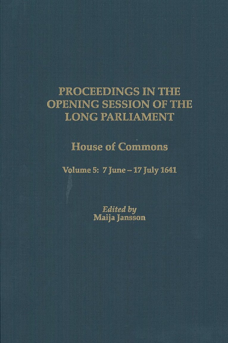 Volume 5 of Proceedings in the Opening Session of the Long Parliament covers the period from 7 June through 17 July 1641, during which time the Act of Pacification with Scotland was finalized; this is the penultimate volumeof text in the edition.Volume 5 of Proceedings in the Opening Session of the Long Parliament covers the period from 7 June through 17 July 1641 and is the penultimate volume of text in the edition. Volume 6 will contain the proceedings from 19 July to the recess on 9 September 1641. The last volume of the edition will contain the comprehensive index and various appendixes and tables.In the summer months of 1641 as parliamentarians prepared for a recess and reunions with families from whom they had been long separated, their accomplishments were apparent: important bills had been passed, impeachments were drafted, Strafford was beheaded and peace with Scotland was on the verge of becoming a reality. Much of the business introduced in the course of the daily meetings since the convening of parliament in November 1640 was touched upon in the last months of summer before the adjournment in September. The effort to complete what was earlier begun is apparent in the topics of debate listed in the Orders of Business for each day. The finalizing of the Act of Pacification with Scotland was the work of these months. The disbanding of troopson both sides, the organizing of the disposition of their weapons, and the settling of the complicated financial arrangements relating to almost all aspects of the peace were a major part of the work described in this volume andcontinued in volume 6. Maija Jansson is Director of the Yale Center for Parliamentary History