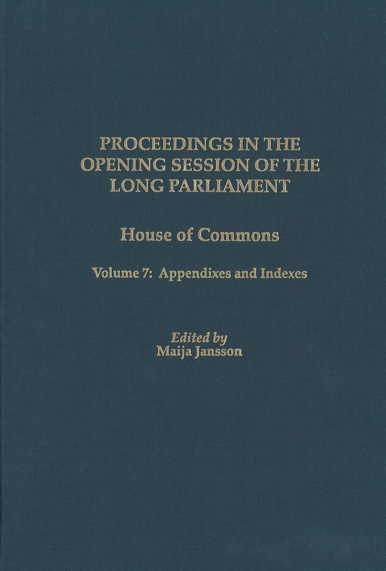 This final volume of the edition includes the Appendix materials [Lists of Members by family name and constituency, Lists of Officials by family name and office, Lists of Committees, Table of Bills, and Chronological Table of Speeches] and the comprehensive Index.Volume 7 is the last volume of the edition of Proceedings in the Opening Session of the Long Parliament compiled by the Yale Center for Parliamentary History and edited by Maija Jansson.It will contain all of theAppendix material referred to in the earlier volumes. It will also contain the Lists of Members, both by family name and constituency, the List of Committees, Table of Bills, List of Petitions, List of Joint Conferences and Reports, and the Comprehensive Index to volumes 1 through 6.Maija Jansson is Director of the Yale Center for Parliamentary History.