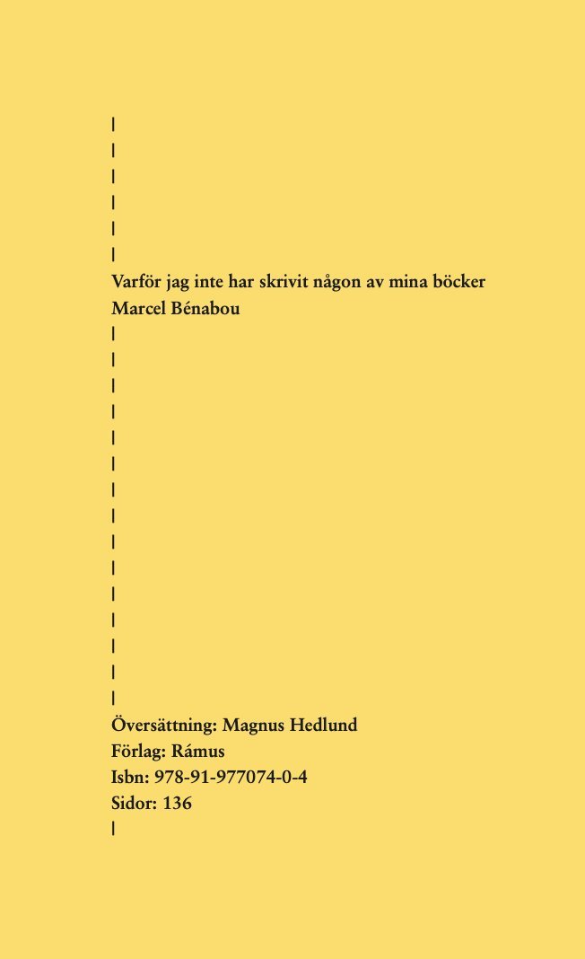 En bok om varför boken du läser aldrig har kommit till, eller snarare möjligheten att du läser den ligger i alla andra böcker som inte har blivit skrivna men som innefattas i detta verk. Eller är boken bara en väntan på de böcker som egentligen ska bli skrivna. Hur förklara Varför jag inte har skrivit någon av mina böcker? Titeln Varför jag inte har skrivit någon av mina böcker är naturligtvis