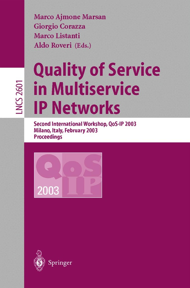 This book constitutes the refereed proceedings of the Second International Workshop on Quality of Service in Multiservice IP Networks, QoS-IP 2003, held in Milano, Italy in February 2003. The 53 revised full papers presented together with an invited paper were carefully reviewed and selected from 97 submissions. The papers are organized in topical sections on analytical models, QoS routing, measurements and experimental results, QoS below IP, end-to-end QoS in IP networks, QoS multicast, optical networks, reconfigurable protocols and networks, provision of multimedia services, QoS in multidomain networks, congestion and admission control, and architectures and protocols for QoS provision.