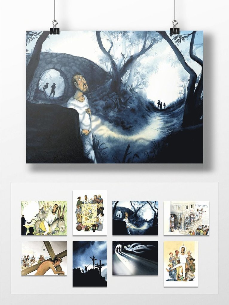 Paket om 8 posters med motiv från påskberättelsen ur Barnens Bästa Bibel. Illustratör Marcus-Gunnar Pettersson. Format 30 x 40 cm. Rama in eller laminera bilderna för att använda vid exempelvis påskvandring och söndagsskola eller som dekoration.