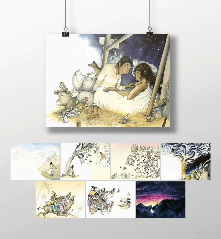 8 posters med motiv från julberättelsen ur Barnens Bästa Bibel. Format 30 x 40 cm.