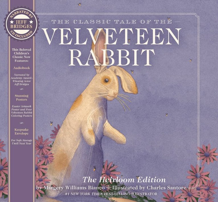 The beloved story of The Velveteen Rabbit, the stuffed animal made real by the love of a boy, has captured our imaginations for generations. In this heirloom edition of the children’s classic featuring audio narration by Jeff Bridges, re-experience the timeless tale of boundless love and the magical transformation it has on our hearts.For nearly a century, this wondrous tale of unconditional love and nursery magic has charmed both children and adults alike as they begin to believe that a velveteen rabbit toy truly can become real. Perfect for young readers ages 1–7, this cherished tale of love and redemption will quickly become a family tradition.This heirloom edition of The Velveteen Rabbit, or How Toys Become Real features:A beautifully designed hardcover with foilGorgeous 4-page fold out illustrationA CD audio book featuring narration by Jeff Bridges, the Academy Award winning actorA Velveteen Rabbit coloring poster and a countdown to Easter posterA keepsake envelope for safe storageThe timeless tale of The Velveteen Rabbit:Is perfect for toddlers or children during bedtime reading or quiet timeIs the original story published in 1922 by author Margery WilliamsHas three times as many illustrations as the originally published workLavish illustrations by renowned New York Times #1 Bestselling artist Charles Santore, the critically-acclaimed illustrator of multiple classic tales including The Night Before Christmas, The Classic Tale of Peter Rabbit, and Aesop's FablesMakes a wonderful Easter basket stuffer or gift for holidays, baby showers, and birthdaysCreate a family tradition with this wonderful volume and make memories your children will cherish for years.Charles Santore’s works has been widely exhibited in museums and celebrated with recognitions such as the prestigious Hamilton King Award, the Society of Illustrators Award of Excellence, and the Original Art 2000 Gold Medal from the Society of Illustrators. He is best known for his luminous interpretations of classic children’s stories, including The Little Mermaid, Alice's Adventures in Wonderland, Snow White, and The Wizard of Oz.