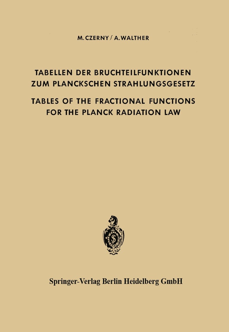 In Wissenschaft und Technik muB In many scientific and technical man ofters mit dem Planckschen Strah- investigations it is necessary to perform lungsgesetz zahlenmaBige Rechnungen numerical calculations with the Planck durchfiihren. Das war bisher wegen der radiation law. Because of the form of Form des Gesetzes sehr miihsam. Das the law, however, these calculations vorliegende Buch enthalt Tabellen, have until now been quite cumbersome. welche die Arbeit sehr erleichtern. The tables presented in this book are Manche naheliegenden Fragen, die man intended to simplify greatly the work bisher wegen rechnerischer Schwierig- involved. As a result, a number of keiten nicht angreifen konnte, lassen problems which until now could not be sich iiberhaupt erst jetzt rasch und treated because of their computational ohne groBe Miihe beantworten. difficulty can now be solved quickly and easily. Der einleitende Textteil ist nicht No attempt has been made to present dazu bestimmt, die physikalische Be- the physical interpretation or the appli- deutung oder die Anwendungsmoglich- cability of the radiation law in the fol- keit des Strahlungsgesetzes darzulegen, lowing introductory text.It is assumed, sondern setzt eine gewisse Vertrautheit rather, that the reader has some famil- des Lesers mit dem Gebiet voraus. Er- iarity with the field. The first part of lautert wird zunachst, welche Funk- the text defines the functions which are tionen tabelliert sind.