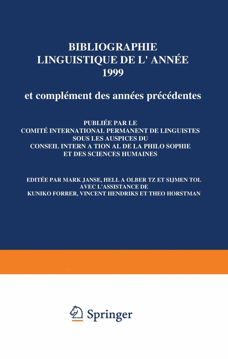 The present volume of Bibliographie Linguistique I Linguistic Bibliography is the fifty-second to have been published to date. An important innovation is the revised and much expanded classification of the languages of South America. BLonline, the internet version of BL, was officially presented on 21 March 2003 at a symposium in the Koninklijke Bibliotheek, the National Library of the Netherlands, and subsequently at the XVIIth International Congress of Linguists, which was held in Prague, from 24 through 29 July 2003. BLonline now offers over 150,000 titels and is available at . The publication of this volume marks a special event in the history of BL. Dr. Zdenek Tyl and Dr. Milena Tylova (prague) have ended their faithful collaboration after having served as correspondents for the Czech Republic (formerly Czechoslovakia) since 1963. We are very pleased to report that the Ustav pro jazyk cesky, the Institute for the Czech Language, will take over their task. The present volume is also the last to have profited from the expert collaboration of Dr. Rolf Kodderitzsch (Bonn) who has been our correspondent for Celtic linguistics for thirteen years. We kindly thank Dr. Tyl, Dr. Tylova and Dr. Kodderitzsch for their much appreciated efforts. We also gratefully acknowledge the continued contributions from Prof. Dr. Winfried Boeder (Oldenburg) and from the Linguistic State University of Minsk in the fields of Caucasian and Belorussian linguistics.