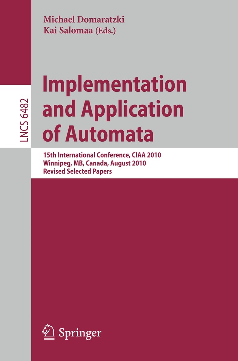 This book constitutes the thoroughly refereed papers of the 15th International Conference on Implementation and Application of Automata, CIAA 2010, held in Manitoba, Winnipeg, Canada, in August 2010.The 26 revised full papers together with 6 short papers were carefully selected from 52 submissions. The papers cover various topics such as applications of automata in computer-aided verification; natural language processing; pattern matching, data storage and retrieval; bioinformatics; algebra; graph theory; and foundational work on automata theory.