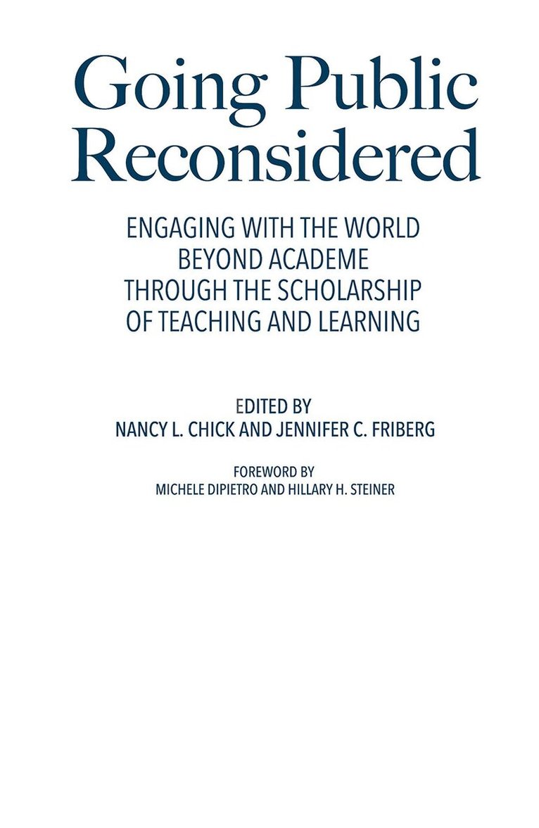 Through its impact on students in their lives in and beyond college, and recognizing the porous boundary between the classroom and the “real world,” SoTL can offer insights into broader societal issues, offer evidence of activities that facilitate everyday learning, promote intrinsic motivation, better support people from underrepresented communities, or uncover the ripple effects of changing educational environments. It has the potential to deliver messages of broad public interest. This book extends the field-building work of Boyer’s Scholarship Reconsidered and Hutchings, Huber, and Ciccone’s The Scholarship of Teaching and Learning Reconsidered by taking a new look at SoTL’s ubiquitous call to “go public.” Going Public Reconsidered explores the potential impacts of knowledge generated by SoTL, considers its varied public audiences, and offers guidance for the appropriate media and modes of communication to reach them, including the use of social media. It urges the SoTL community to step up and contribute its expertise to conversations about the crises that face our communities, nations, and the world, and disseminate the relevance of its research for the world outside of the classroom.Recognizing that many practitioners find it difficult to conceptualize the public in public SoTL beyond the higher education audiences they routinely address, this book focusses on conceptualizing, planning, and shaping the message, and clarifying appropriate audiences. It offers guidance on the “who” and the “how” of public SoTL. Going Public Reconsidered addresses such questions as: ● What is happening in the world that would benefit from a SoTL-informed perspective?● What information, insight, or knowledge does SoTL generate?● Who beyond higher education might care about this information, insight, or knowledge, and why?● How can we adapt to the venues and platforms where they currently get their information and knowledge?The fifteen editors and contributors explore the potential and the implications of extending SoTL beyond its current horizons by reflecting on the ultimate responsibility of those who profess SoTL; examining SoTL’s audiences and the notion of “the public”; considering what topics and Grand Challenges public SoTL might address; offering case studies of outreach in the US and abroad; and providing guidance on the use of social media for public SoTL – from Twitter, Facebook, LinkedIn, and YouTube to blogs – as well as on developing relationships with mainstream media. The book’s message is that public SoTL isn’t a radical departure from SoTL-as-we-know-it, but a natural expansion of its methods and goals, offering the potential of broadening its impact domestically and internationally. It offers inspiration and challenges to practitioners across the globe.