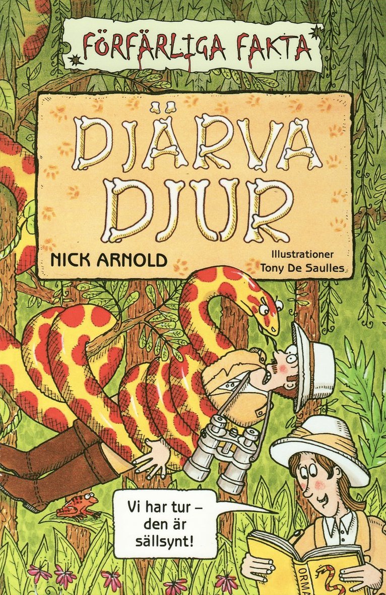 Välkommen till djurens spännande värld! Läs om: - gamla tiders ormbettskurer - hur djuren kan kamouflera sig - den fantastiska, trädklättrande fisken - hur vampyrfladdermusen gör när den suger blod. Ta reda på mer om djurens jaktmetoder och märkliga matvanor, om hur de tar hand om sina ungar och hur man kan bli vän med en gorilla. Lär känna några riktigt envisa naturforskare - och en samling extremt giftiga ormar. Fullspäckad med illustrationer, frågesporter och ovanliga faktarutor blir det inget hästjobb att ta sig igenom Djäva djur! I serien Förfärliga Fakta har Nick Arnold även skrivit "Blod, ben och baciller" (2005), "Kaotisk kemi" (2005), "Krafter att räkna med" (2006) och "Fula kryp" (2007).
