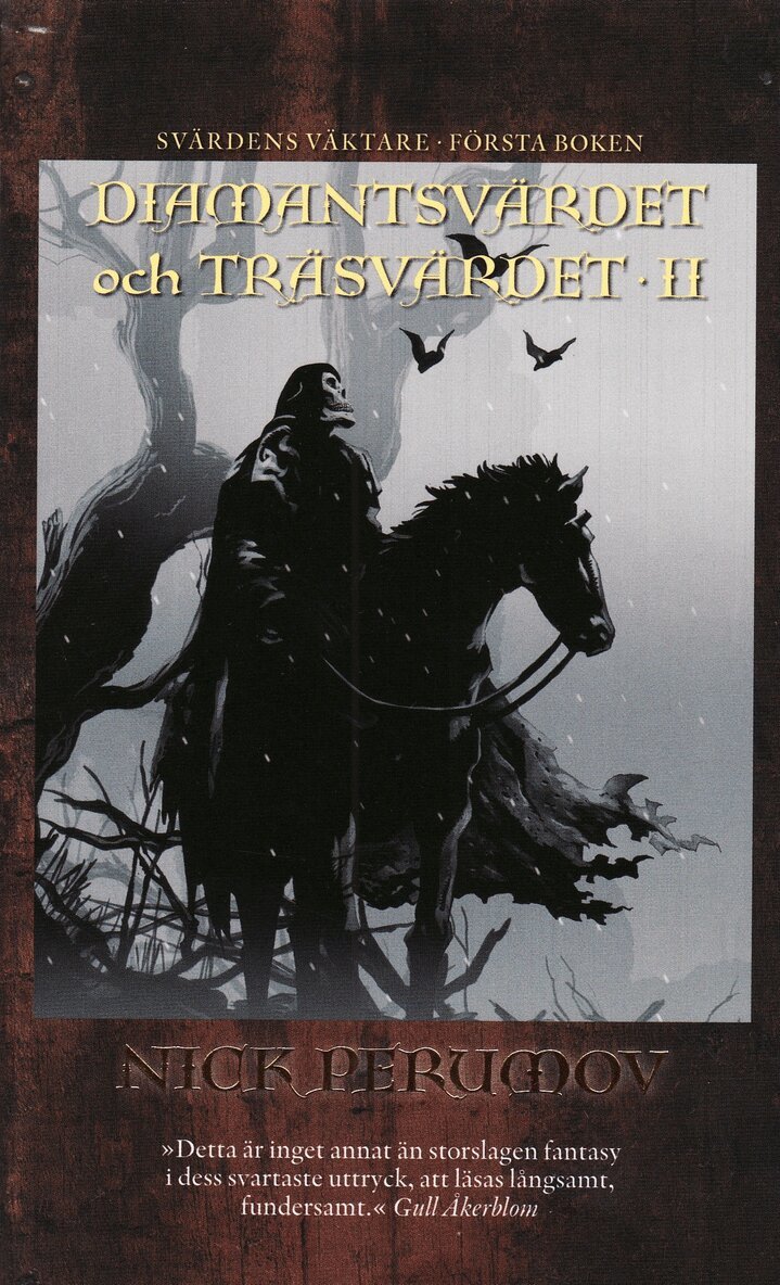 »Nick Perumov är bara Nick Perumov och inte Tolkiens efterföljare, men att jämföra med honom. Det här är hans magnus opus. Det är drivet, väldigt medryckande och spännande.« Yukiko Duke, Gomorron Sverige, SVT Efter den ödesdigra sammandrabbningen mellan kejsaren och magikerorden Regnbågen vanställs Melinvärlden av den bottenlösa Rämnan. De båda svärden som orsakat kriget, Diamantsvärdet och Träsvärdet, är försvunna och kejsarens unge rådgivare, legoknekten Fess, finner sig utkastad i en annan värld Evial. Hans minne är utraderat och på Akademien för högre magi, där han antas som student, spekulerar man i om främlingen, trots teorin om världens slutenhet, kommer utifrån och kanske är den Mörkrets messias vars ankomst Saladoréens bannlysta traktat så länge har förutspått. För att klara sig i den nya världen, där Frälsarens kyrka och Heliga inkvisitionen håller befolkningen i tukt, förmaning och skräck medan allt fler byar drabbas av oroliga kyrkogårdar där de odöda reser sig ur gravarna, väljer Fess nekromantikerns svåra bana. Dubbelt främling, såväl inför sig själv som andra, fruktad och avskydd av nästan alla, tvingas han skärskåda sig själv: Är han verkligen den som skall bringa världen på fall eller kan han avvärja en större ondska genom att göra sig skyldig till en mindre? Under tiden har stridsmagikern Klara Kummel och hennes följeslagare gått vilse på Mellanverklighetens stigar och söker förtvivlat efter vägen hem till Dalen Svärdens väktare är en serie om åtta fristående böcker. Perumov utsågs 2004 till Europas bäste inom genren och valdes 2007 för andra gången till årets fantasyförfattare i Ryssland. FÖRFATTAREN OM »SVÄRDENS VÄKTARE«: »Det här är berättelsen om vad som händer när man väljer det minst onda alternativet. Jag vill visa att man ibland måste skapa det goda med hjälp av det onda, eftersom det inte finns något annat att börja med. Huvudpersonen Fess är nekromantiker, alltså en person som utvinner kunskap ur de döda, och han måste utföra vidriga ritualer och vara grym, både mot sig själv och andra. Det resulterar i smärta och det plågar honom, men han måste bekämpa obalanserna som uppstått i världen. Det är också berättelsen om en ung kejsare, som uppfostrades som en vargunge och berövades alla mänskliga känslor. Han startar ett krig för att återvinna sin mänskliga identitet. Sedan finns det många andra personer också, för det är en komplicerad värld full av gudar och andra.« Nick Perumov KRITIKERRÖSTER »Den stora skräcken i Diamantsvärdet och träsvärdet är inte lynchningarna, gruppvåldtäkterna eller den utstuderade tortyr som magikerna är mäktiga. Nej, ty döden kommer inte till slut som en befriare utan är bara ytterligare en plats dit förföljarna kan nå. Nekromantin är utbredd, den otäcka förmågan att väcka döda till viljelöst slavliv. Det får Tolkiens Mordor att verka lika farligt som en stockholmsk korvkiosk en fredagskväll« Lotta Olsson, Dagens Nyheter