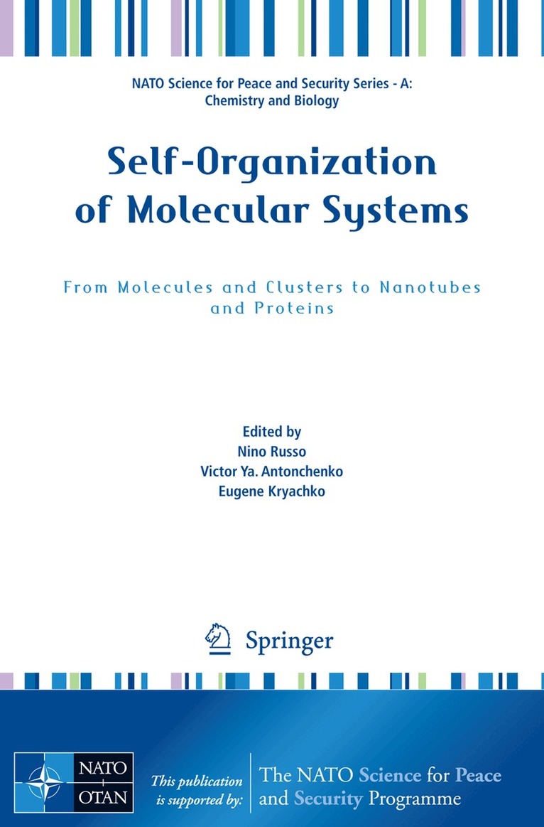 The NATO ARW "Molecular Self-Organization in Micro-, Nano-, and Macro- Dimensions: From Molecules to Water, to Nanoparticles, DNA and Proteins" to commemorate Professor Alexander S. Davydov was held in Kiev, Ukraine, on 8-12 June, 2008, at the Bogolyubov Institute for Theoretical Physics of the National Academy of Sciences of Ukraine. Theobjective ofthisNATOARWistounveilandformulatetheprincipalfeatures that govern myriads of the molecular self-organization processes in micro-, nano-, and macro-dimensions from the following key representatives such as liquid - ter and aqueous solutions, and molecular liquids, nanodots, nanoparticles including gold, solitons, biomolecules such as DNA and proteins, biopolymers and bios- sors, catalysis, molecular modeling, molecular devices, and thin ?lms, and to offer another, more advanced directions in computational, experimental, and technolo- cal areas of nano- and bioscience towards engineering novel and powerful molecular self-organized assemblies with tailored properties. Nanoscience is indeed one of the most important research and development fr- tiers in modern science.Simplistically, nanoscience is the science of small particles of materials of a size of nanometre. Molecular nanoscience and nanotechnology have brought to us the unprecedented experimental control of the structure of matter with novel extraordinary properties that open new horizons and new opportunities, and new ways to make things, particularly in our everyday life, to heal our bodies, and to care of the environment. Unfortunately, they have also brought unwelcome advances in weaponry and opened yet more ways to foul up the world on an en- mous scale.