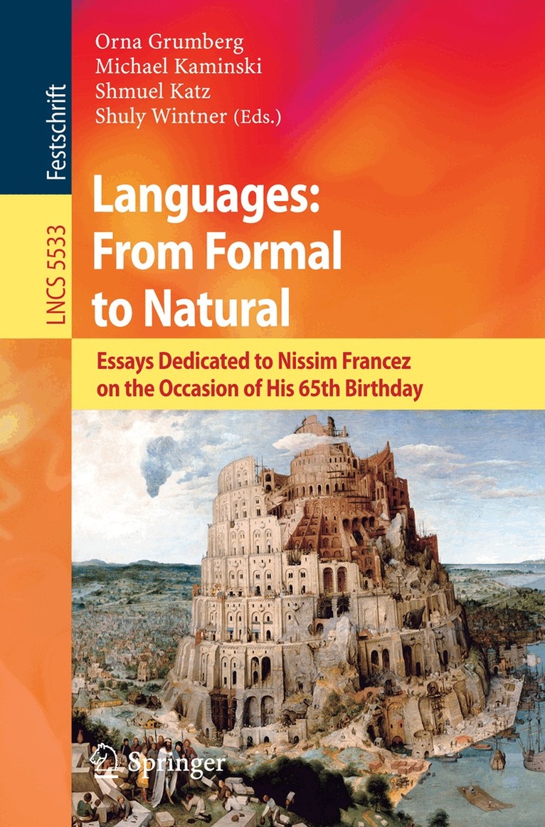 The symposium "Languages: From Formal to Natural," celebrating the 65th birthday of Nissim Francez, was held on May 24-25, 2009 at the Technion, Haifa. The symposium consisted of two parts, a veri?cation day and a language day, and covered all areas of Nissim's past and present research interests, areas which he has inspiringly in?uenced and to which he has contributed so much. This volume comprises severalpapers presentedat the symposium, as wellas additional articles that were contributed by Nissim's friends and colleagues who were unable to attend the event. We thank the authors for their contributions. Wearealsogratefultothereviewersfor their dedicated and timely work. Nissim Francez was born on January 19, 1944. In 1962 he started his mat- matical education at the Hebrew University. He received a BSc in Mathematics in 1965, and, after four years of military service, started his MSc studies in Computer Science at the Weizmann Institute of Science under the supervision of Amir Pnueli. After completing the MSc program in 1971, Nissim continued his studies toward a PhD, again, at the Weizmann Institute of Science and, again, under the supervisionof Amir Pnueli.Nissim wasawardeda PhDin Computer Science in 1976.