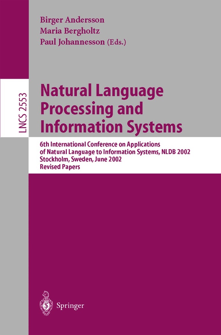 This book constitutes the thoroughly refereed post-proceedings of the 6th International Conference on Applications of Natural Language to Information Systems, NLDB 2002, held in Stockholm, Sweden in June 2002. The 17 revised full papers and 7 revised short papers presented were carefully selected from 42 submissions during two rounds of reviewing and revision. The papers are organized in topical sections on linguistic aspects of modeling, information retrieval, natural language text understanding, knowledge bases, recognition of information in natural language descriptions, and natural language conversational systems.