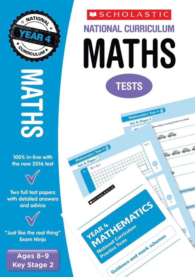 Check your child's progress with these new format National CurriculumSATs tests.These practice tests are designed to check children's level of understandingat the end of Year 4.Each pack comes with two complete practice tests and an accompanyingGuidance and Mark Scheme booklet.These practice tests have a similar look and feel to the new KeyStage 2 Mathematics SATs test, to help familiarise children withboth the content and format of these tests. The tests can be usedto track progress in school, but can also be used in the home. TheGuidance and Mark Scheme provides advice for parents and carerson how to use the tests and how to support children in preparingfor them.Scholastic National Curriculum Revision Year 4 is also available,offering children the opportunity to check their progress acrossthe Mathematics curriculum and to develop the skills they need forthese national tests.