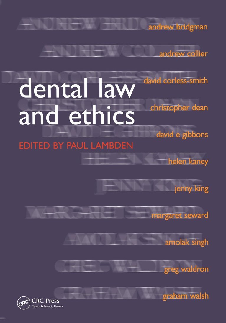 This is an invaluable book for practitioners and students alike. It is written by a wide range of distinguished contributors who have expertise in all aspects of dental practice. Readable and authoritative, subjects range from confidentiality, consent, mental disabilities and negligence, and the practical aspects of managing complaints and claims. Where differences occur, as in Scotland, these are fully explained. Developments in revalidation and continuing professional education make this a timely publication which should be readily available to every dentist and dental student. It provides clear and comprehensive guidance on key legal and ethical issues, and emphasises the standards which are now expected by patients and the profession.