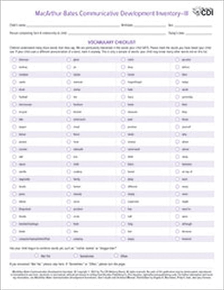 CDI-III, part of the third edition of the MacArthur-Bates Communicative Development Inventories (CDIs), is a short, 2-page tool that measures language and communication skills for children between the ages of 30 to 37 months. Parents complete this quick instrument to document a child's expressive vocabulary and grammar. It is available in a pack of 25 paper forms on a tablet.For use with the MacArthur-Bates Communicative Development Inventories (CDIs), these CDI-III Forms, sold on a tablet of 25 paper forms, offer a quick measure of vocabulary and grammar skills for children between the ages of 30 to 37 months.WHAT'S NEWThe third edition of the CDIs includes updated norms, additional tools, and more administration formats and helpful resources. Here's a look at what's new:Expanded and more representative norms—more than 4,000 new children have been added to the norming dataset for the CDI: Words and Gestures and CDI: Words and Sentences. Norming tables have been statistically adjusted to reflect key U.S. demographic indicators.More options for electronic administration of the CDIs, including fillable PDFs and a new web-based administration platform, Web-CDINew picture-based instructions with easy-to-understand illustrations and examplesMore extensive administration and scoring guidelinesMore on using the CDIs with bilingual and multilingual childrenAn expanded chapter on the CDI-IIIDetailed guidelines about choosing the most appropriate CDI forms when several are potentially usefulExpanded guidelines on the use of CDI short forms, including new statistically-adjusted norms and information on reliability and validityMore CDI resources available online, including Wordbank, an open repository of CDI data in 38 languages representing more than 84,000 childrenA rapid, valid Computerized Adaptive scale for expressive vocabulary, now available through Web-CDIA helpful list of frequently asked questions