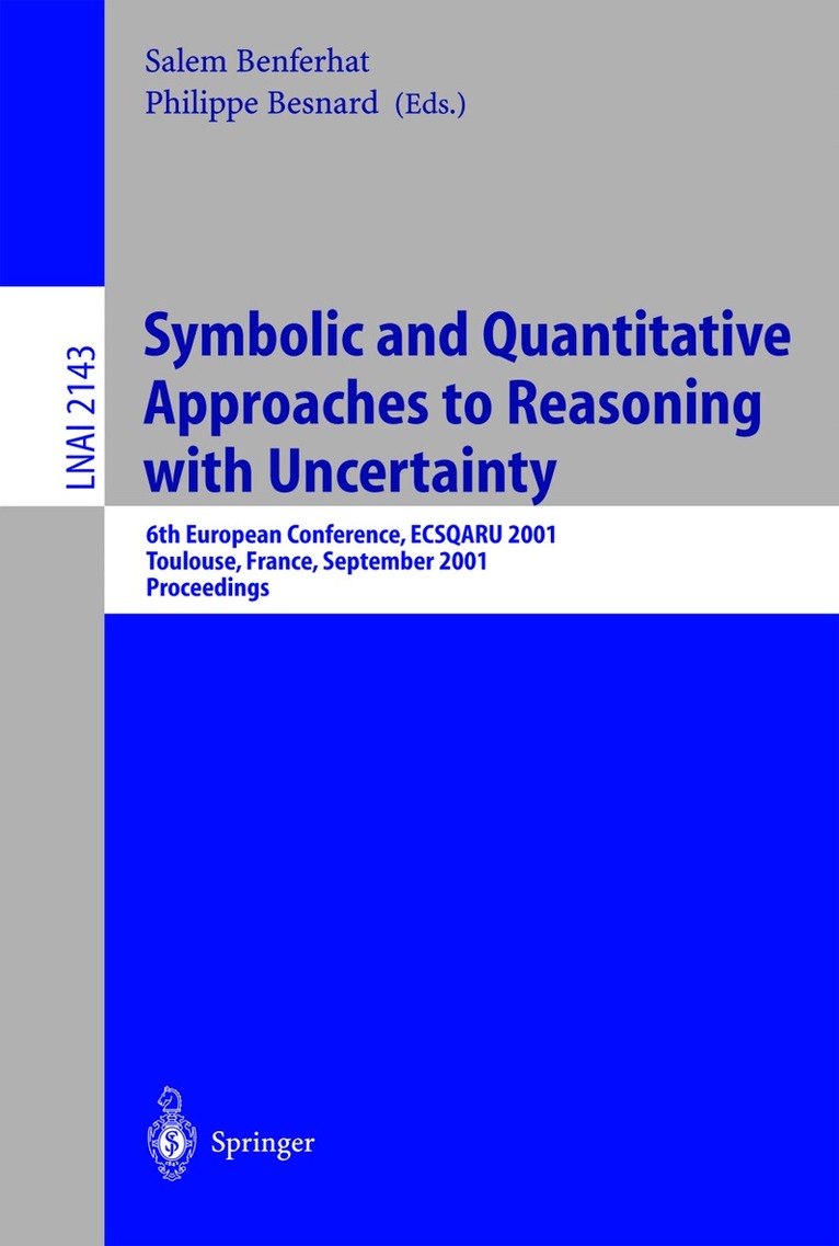 This book constitutes the refereed proceedings of the 6th European Conference on Symbolic and Quantitative Approaches to Reasoning with Uncertainty, ECSQARU 2001, held in Toulouse, France in September 2001.The 68 revised full papers presented together with three invited papers were carefully reviewed and selected from over a hundred submissions. The book offers topical sections on decision theory, partially observable Markov decision processes, decision-making, coherent probabilities, Bayesian networks, learning causal networks, graphical representation of uncertainty, imprecise probabilities, belief functions, fuzzy sets and rough sets, possibility theory, merging, belief revision and preferences, inconsistency handling, default logic, logic programming, etc.