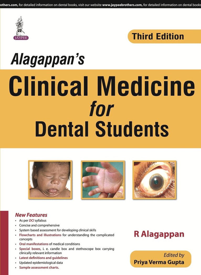 Alagappan’s Clinical Medicine for Dental Students is the latest edition of this comprehensive student resource. Updated epidemiological data and new flowcharts and illustrations bring the book firmly up to date.Divided into 55 chapters across nine sections, the first section covers general medical assessment, providing a sample assessment chart at the end of the section. Further sections cover specific parts and systems of the body, including abdomen, cardiovascular system, respiratory system, haematology and endocrinology. The final two sections cover nutrition and infectious diseases.Oral manifestations of medical conditions are defined clearly for medical students, under separate headings where necessary, and text boxes are included to highlight key information. This new edition features the latest definitions and guidelines on clinical medicine in dentistry.With highly relevant and up to date information enhanced by 264 full colour images and illustrations, Alagappan’s Clinical Medicine for Dental Students is an ideal reference book and revision resource for undergraduate dental students.Key Points New edition of this comprehensive guide to clinical medicine for dental studentsPrevious edition published 2009 (9788184485288)264 full colour images and illustrations