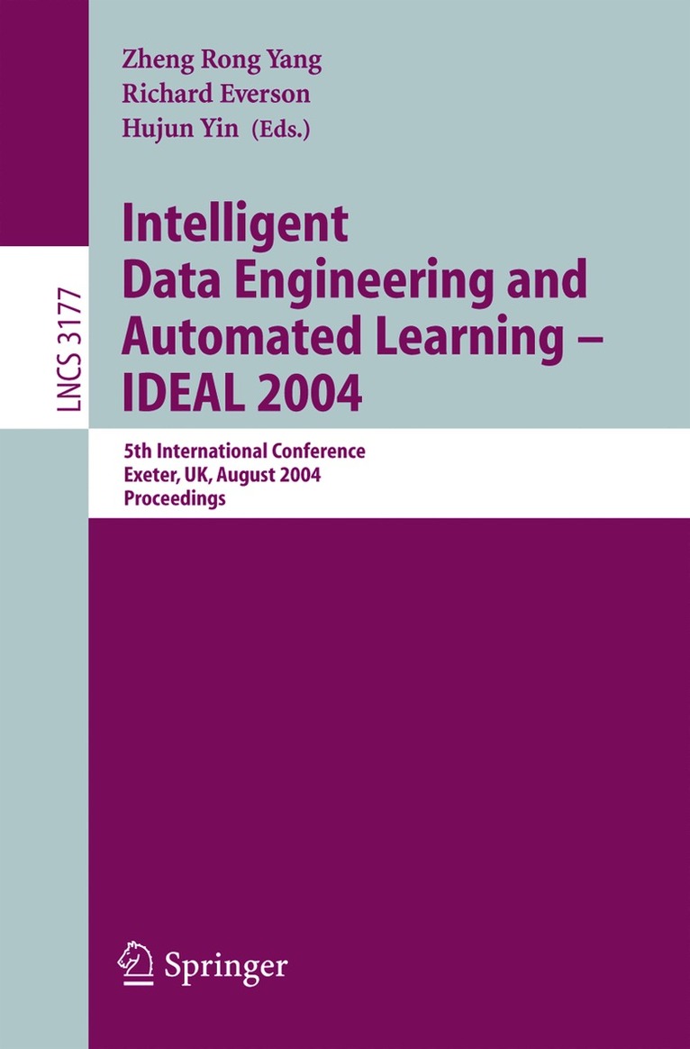 The Intelligent Data Engineering and Automated Learning (IDEAL) conf- ence series began in 1998 in Hong Kong, when the world started to experience information and data explosion and to demand for better, intelligent meth- ologies and techniques. It has since developed, enjoyed success in recent years, and become a unique annual international forum dedicated to emerging topics and technologies in intelligent data analysis and mining, knowledge discovery, automated learning and agent technology, as well as interdisciplinary appli- tions, especially bioinformatics. These techniques are common and applicable to many ?elds. The multidisciplinary nature of research nowadays is pushing the boundaries and one of the principal aims of the IDEAL conference is to p- mote interactions and collaborations between disciplines, which are bene?cial and bringing fruitful solutions. This volume of Lecture Notes in Computer Science contains accepted papers presented at IDEAL 2004, held in Exeter, UK, August 25-27, 2004. The conf- ence received 272 submissions from all over the world, which were subsequently refereed by the ProgramCommittee.Among them 124 high-quality papers were accepted and included in the proceedings. IDEAL 2004 enjoyed outstanding keynote talks by distinguished guest speakers,Jim Austin, Mark Girolami, Ross King, Lei Xu and Robert Esnouf. This year IDEAL also teamed up with three international journals, namely the International Journal of Neural Systems,the Journal of Mathematical M- elling and Algorithms,and Neural Computing & Applications. Three special issues on Bioinformatics, Learning Algorithms,and Neural Networks & Data Mining, respectively, have been scheduled for selected papers from IDEAL 2004.
