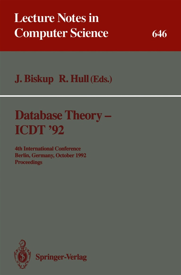 The papers in this volume were presented at theInternational Conference on Database Theory, held in Berlin,Germany, October 14-16, 1992. This conference initiated themerger of two series of conferences on theoretical aspectsof databases that were formed in parallel by differentscientific communities in Europe. The first series was knownas the International Conference on Database Theory and thesecond as the Symposium on Mathematical Fundamentals ofDatabase Systems. In the future, ICDT will be organizedevery two years, alternating with the more practicallyoriented series of conferences on Extending DatabaseTechnology (EDBT). The volume contains 3 invited lectures and 26 contributedpapers selected from a total of 107 submissions. The papersare organized into sections on constraints anddecomposition, query languages, updates and activedatabases, concurrency control and recovery, knowledgebases, datalog complexity and optimization, objectorientation, information capacity and security, and datastructures and algorithms. Two of the invited papers surveyresearch into theoretical database issues done in EasternEurope during the past decade.