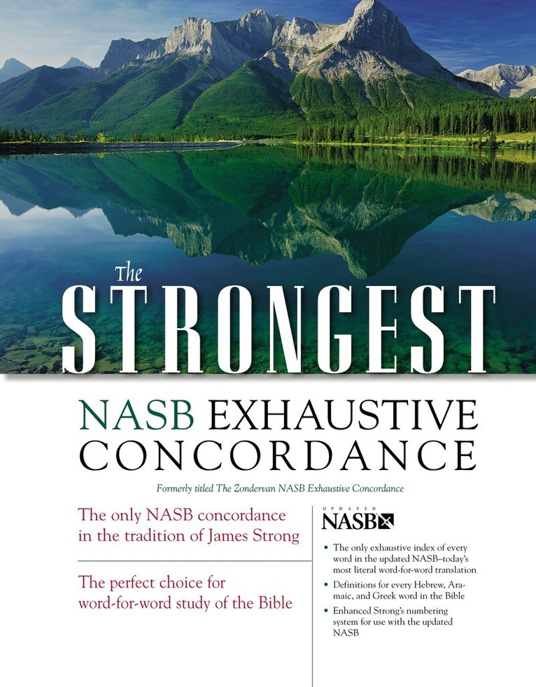 With over 400,000 entries listing every word in the updated NASB (New American Standard Bible), The Strongest NASB Exhaustive Concordance gives you a powerful and essential reference tool for scaling the heights and plumbing the depths of God’s Word. Locate even the most obscure Scripture verses quickly and easily. Conduct thorough, revealing word studies that uncover shades of meaning from the original Bible languages. Organize your own studies on subjects of your choosing. The Strongest NASB Exhaustive Concordance lets you do it all. It’s the cornerstone of your NASB resource library.Features Include:Every word in the updated NASB listed alphabetically and referenced in order of appearance to every book, chapter, and verse of the Bible.Over 400,000 entries.Enhanced Strong’s numbering system for use with updated NASB.Hebrew/Aramaic and Greek dictionaries trace words in the NASB text to their equivalents in the original Bible languages for a better understanding of their meaning and application.Clear instructions for use of the concordance and dictionaries.Select bibliography and more.