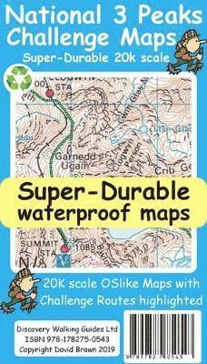 National 3 Peaks Challenge Maps. Ben Nevis, Scafell Pike and Snowdon at 20k scale. Waterproof, tearproof and 100% recyclable 820mm by 420mm double sided map sheet. Taking OS mapping at 50k scale we expand the mapping to produce 20k scale maps of the three challenge peaks, Ben Nevis, Scafell Pike and Snowdon. By expanding the OS mapping the features of names, roads, tracks and trails are more than doubled in size making them easier to read under Challenge conditions. We then add the Challenge Routes, specially highlighted to make them stand out against the OS map background information and add in additional information that will help your challenge. Each map covers the region to show the access roads as well as the walking routes. Ben Nevis includes the Glen Nevis Information Centre starting point and Glen Nevis Youth Hostel starting point. Scafell Pike includes the Wasdale and Seathwaite Challenge Routes. Snowdon includes the Pyg Track, Miners Track and Llamberis Challenge Routes. Each peak is a 420mm by 420mm OSlike map mounted on a double sided map sheet of 840mm by 420mm. The map designs are then printed on a 100 micron plastic substrate using UV cured inks on the UK's only press capable of using this latest technology. The result is a lightweight map that is both waterproof and tearproof, and fully recyclable, that will survive anything your 3 Peaks Challenge can throw at it and afterwards will fold up like new.
