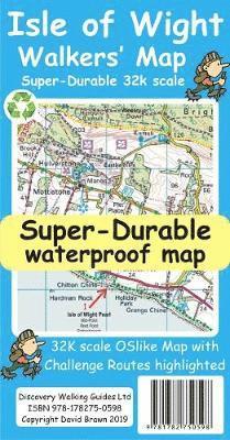 Isle of Wight Walkers' Map at 32k scale with challenge routes and walking trails highlighted. OS 50k scale mapping is expanded in size to produce a 32k map. The OS features, text and logos are now 50% larger making them much easier to read under outdoor conditions. Isle of Wight Challenge Route (66 miles) is specially highlighted in green and white so that the route stands out against the OS background map. Then we add the Earl Mountbatten Hospice's Walk (26.5 miles) highlighted in gold and white. A large range of gps surveyed walking trails are then highlighted in grey and white. The result is an easy to read `OSlike' map with walking trails specially highlighted. We then split the island into East (cover side) and West (reverse side) with a ten mile common overlap to the two sides; meaning you will only have to turn the map over if you are undertaking the longest Challenge or Earl Mountbatten routes. The result is a double sided 840mm by 694mm OSlike Super-Durable Map. We then print the map design on a 100 micron plastic substrate using a special UV curing inks process on the UK's only press capable of using this latest technology. The printed map sheets are then folded using a special concertina map fold to its pocket size of 230mm by 120mm. The result is the Isle of Wight Walkers' Map. A lightweight map that is both accurate and easy to read and use. Super-Durable means your map is waterproof and tearproof, and fully recyclable. This map will survive anything your Isle of Wight Challenges can throw at it and afterwards will fold up like new. Buying the Isle of Wight Walkers' Map also entitles you to receive the Custom Map digital edition of the map as a free download from Discovery Walking Guides.