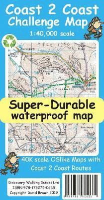 The whole 'Wainwright' Coast to Coast on one double sided, 960mm by 694mm, map sheet. All 193 miles (308 kilometres) of the Wainwright route along with its alternatives are highlighted across 9 map sections at 40k scale. Ordnance Survey accuracy is combined with Tour & Trail map design to produce 40k scale map sections which are easy to read. OS 50k Landranger mapping is expanded to 40k scale making the text and features over 40% larger making them easy to read and understand. Wainwright's C2C walking routes, and their alternatives, are specially highlighted in Tour & Trail style making the routes easy to find on the map and on the ground. Public `Rights of Way' paths and bridleways are also highlighted in Tour & Trail style making them easy to recognise and find. Coast 2 Coast Challenge Map design is then printed on Polyart using 100% oxygenation inks to produce a lightweight, Super-Durable, waterproof map that is tough enough to shrug off the worst that the C2C can subject it to and still fold up like new at the end of each day. In addition to the Super-Durable printed map, Discovery Walking Guides offers you a free `C2C Digital Resources Package'. Simply follow the instructions on the map to receive a download link to the zip file, which contains all 9 map sections as digital Custom Map editions in kmz file format along with 13 gpx waypoint files covering the 13 stages of the C2C. Combining the Super-Durable Map with the Digital Resources Package gives you trouble free navigation for the whole C2C Challenge route from St Bees to Robin Hood's Bay.