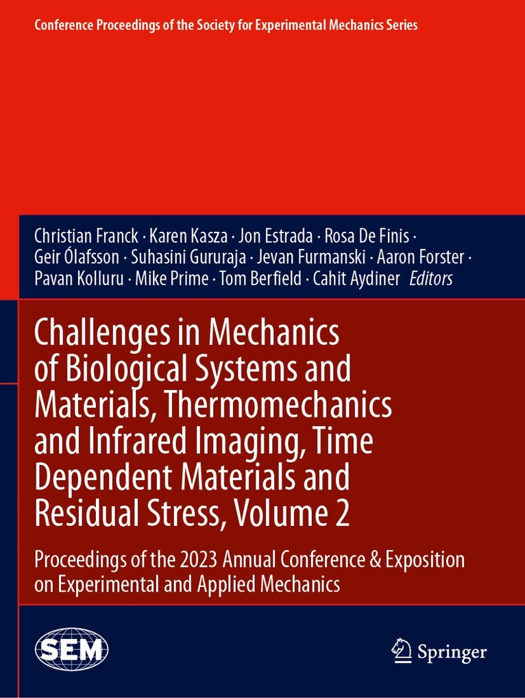 Challenges in Mechanics of Biological Systems and Materials, Thermomechanics and Infrared Imaging, Time Dependent Materials and Residual Stress, Volume 2 of the Proceedings of the 2023 SEM Annual Conference & Exposition on Experimental and Applied Mechanics, the second volume of five from the Conference, brings together contributions to this important area of research and engineering. The collection presents early findings and case studies on fundamental and applied aspects of Experimental Mechanics, including papers in the following general technical research areas: Advanced Thermographic Techniques for SHMAM Composites and PolymersExperimental Techniques in Biomechanics and MechanobiologyInverse Methodologies and Uncertainties in the Identification of Residual Stresses, Residual Stress IVLow Cost Thermographic ApplicationsMultiscale Mechanics of Biological MaterialsNDE and Process MonitoringResidual StressThermomechanicsTime Dependence in Porous and Soft Materials