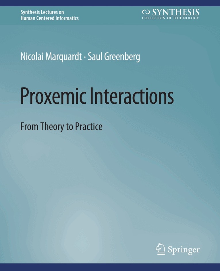 In the everyday world, much of what we do as social beings is dictated by how we perceive and manage our interpersonal space. This is called proxemics. At its simplest, people naturally correlate physical distance to social distance. We believe that people’s expectations of proxemics can be exploited in interaction design to mediate their interactions with devices (phones, tablets, computers, appliances, large displays) contained within a small ubiquitous computing ecology. Just as people expect increasing engagement and intimacy as they approach others, so should they naturally expect increasing connectivity and interaction possibilities as they bring themselves and their devices in close proximity to one another. This is called Proxemic Interactions. This book concerns the design of proxemic interactions within such future proxemic-aware ecologies. It imagines a world of devices that have fine-grained knowledge of nearby people and other devices—how they move into range, their precise distance, their identity, and even their orientation—and how such knowledge can be exploited to design interaction techniques. The first part of this book concerns theory. After introducing proxemics, we operationalize proxemics for ubicomp interaction via the Proxemic Interactions framework that designers can use to mediate people’s interactions with digital devices. The framework, in part, identifies five key dimensions of proxemic measures (distance, orientation, movement, identity, and location) to consider when designing proxemic-aware ubicomp systems. The second part of this book applies this theory to practice via three case studies of proxemic-aware systems that react continuously to people’s and devices’ proxemic relationships. The case studies explore the application of proxemics in small-space ubicomp ecologies by considering first person-to-device, then device-to-device, and finally person-to-person and device-to-device proxemic relationships. We also offer a critical perspective on proxemic interactions in the form of “dark patterns,” where knowledge of proxemics may (and likely will) be easily exploited to the detriment of the user. Table of Contents: Acknowledgments / Videos / Figure Credits / Introduction / Part I / Ubicomp in Brief / Proxemic Interactions Theory / Operationalizing Proxemics for Ubicomp Interaction / Exploiting Proxemics to Address Challenges in Ubicomp Ecologies / Part II: Exploiting Proxemics in Ubicomp Ecologies / Person/Person-to-Device Proxemic Interactions / Device-to-Device Proxemic Interactions / Considering Person-to-Person and Device-to-Device Proxemics / Dark Patterns / Conclusion / References / Author Biographies