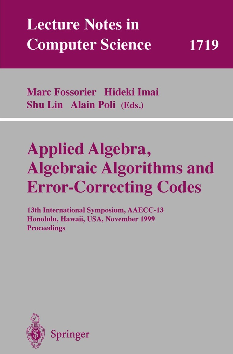 This book constitutes the refereed proceedings of the 19th International Symposium on Applied Algebra, Algebraic Algorithms and Error-Correcting Codes, AAECC-13, held in Honolulu, Hawaii, USA in November 1999.The 42 revised full papers presented together with six invited survey papers were carefully reviewed and selected from a total of 86 submissions. The papers are organized in sections on codes and iterative decoding, arithmetic, graphs and matrices, block codes, rings and fields, decoding methods, code construction, algebraic curves, cryptography, codes and decoding, convolutional codes, designs, decoding of block codes, modulation and codes, Grobner bases and AG codes, and polynomials.