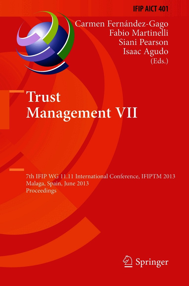 This book constitutes the refereed proceedings of the 7th IFIP WG 11.11 International Conference on Trust Management, IFIPTM 2013, held in Malaga, Spain, in June 2013. The 14 revised full papers and 9 short papers presented were carefully reviewed and selected from 62 submissions. The papers cover a wide range of topics focusing on multi-disciplinary areas such as: trust models, social foundations of trust, trust in networks, mobile systems and cloud computation, privacy, reputation systems, and identity management.