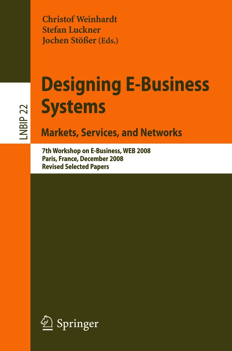The 7th Workshop on e-Business (WeB 2008) was held on December 13, 2008, in Paris. As a pre-ICIS workshop, it provided an open forum for e-business - searchersandpractitionerstoshareresearch?ndings,explorenovelideas,discuss success stories and lessons learned, and map out major challenges with regard to the design of e-business systems. The workshop theme was "Designing e-Business Systems: Markets, Services and Networks." With WeB 2008 having been located in Europe, we wanted to highlight the increasing importance of the design science approach for infor- tionsystemsresearch,which hasa longtraditionin theEuropeanIS community. We received a large number of submissions that addressed key issues speci?c to the workshop theme as well as e-business in general. Based on a rigorous review process, a total of 31 full papers and 30 research-in-progresspapers were accepted for presentation at the workshop, covering a broad range of technical, empirical, managerial,and economic aspects of e-business. Of the 31 full papers, 17 selected papers are contained in this volume of Lecture Notes in Business Information Processing. We hope that you will ?nd them an interesting read and that you will bene?t from the authors' ?ne contributions.
