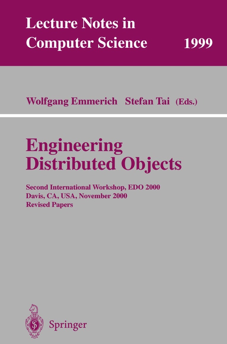 EDO2000wasthesecondinternationalworkshoponsoftwareengineeringfor distributedobjectsystems. EDO2000wasacontinuationofEDO'99,the?rst workshopinthisseries,whichwasheldinconjunctionwithICSE'99. Distributedobjecttechnologies-asexempli?edbyCORBAandtheCORBA Services,COM+,EJB,andtheJ2EE-areincreasinglybeingadoptedbyvarious enterprisesasafundamentaltechnologyfortheirITinfrastructures. Asacon- quence,extensiveindustrypracticeofusingthetechnologiesisbeinggained. At thesametime,thetechnologiescontinuetoadvanceandnewfunctionalityand servicescontinuetobeintroduced. Inordertousetheexistingandemergingfunctionsofdistributedobjectte- nologiese?ectively,andtobettermeettoday'sdemandingbusinessandcomp- ingrequirements,advancesinsoftwareengineeringmethodsandtechniquesfor distributedobjectsarestronglyneeded. Softwareengineeringfordistributed- jectsistheresearchareathatprovidessolutionsofprovenpracticeforissuesand problemsthatareuniquetosystemsemployingdistributedobjecttechnologies. EDOis the premierworkshopthatbringstogetherthe researchandpractice communityofsoftwareengineeringfordistributedobjects. Wereceivedabout30submissionsandtheinternationalprogramcommittee selected15papers.Weclusteredacceptedpapersintosessionsandtheauthors ofthesepaperschampionedthesessionsandtookaleadinthediscussions. The workshoporganizersselectedparticularauthorstogivebriefpresentationsthat wereaimedtokicko?thediscussionineachsession. Theresultofthedi?erent sessionswassummarizedattheendoftheworkshopandthesesessionsummaries areincludedintheseproceedings. Alsointraditionwiththeworkshopseries,wehadaninvitedindustrialp- sentation. ThisyearWalterSchwarztalkedaboutanenterpriseapplication- tegrationprojectinthe?nancialdomainthatdeployedajudiciouscombination ofdistributedobjectmiddlewareandmarkuplanguagestoachieveintegration of?nancialtradingsystems. December2000 WolfgangEmmerichandStefanTai ProgramCo-chairs EDO2000 Program Committee Organization ConferenceChair: VolkerGruhn,UniversityofDortmund,Germany ProgramCo-chairs:WolfgangEmmerich,UniversityCollegeLondon,UK StefanTai,IBMWatsonResearch,U. S. A. OrganizingChair: PremDevanbu,UniversityofCalifornia,Davis,U. S. A. Referees JeanBezivin,UniversityofNantes,France GordonBlair,LancasterUniversity,UK AlfredBro..ckers,AdessoGmbH,Germany PeterCroll,UniversityofWollongong,Australia ElisabettaDiNitto,PolitecnicodiMilano,Italy AlfonsoFuggetta,PolitecnicodiMilano,Italy WilliHasselbring,UniversityofOldenburg,Germany JusukeHashimoto,NEC,Japan WalterHuersch,Zuehlke,Switzerland ArnoJacobson,INRIA,France MehdiJazayeri,TUVienna,Austria GertiKappel,UniversityofLinz,Austria WojtekKozacynski,Rational,USA BerndKr..amer,FUHagen,Germany Je?Magee,ImperialCollege,UK NenadMedvidovic,UniversityofSouthernCalifornia,USA NeilRoodyn,Cognitech,UK DavidRosenblum,UniversityofCaliforniaIrvine,USA IsabelleRouvellou,IBMWatsonResearch,USA WalterSchwarz,DGBank,Germany DirkSlama,ShinkaTechnologies,Germany DanielSteinmann,UBS,Switzerland AlfredStrohmeier,EPFL,Switzerland StanSutton,IBMWatsonResearch,USA Sponsoring Institutions AdessoGmbH,Germany IBMWatsonResearch,U. S. A. Z..uhlkeEngineeringGmbH,Germany Table of Contents Invited Industry Presentation ApplicationIntegrationwithCORBAandXML ...1 WalterSchwarz MiddlewareSelection MiddlewareSelection ...2 StanleyM. SuttonJr. AKeyTechnologyEvaluationCaseStudy: ApplyingaNewMiddlewareArchitectureontheEnterpriseScale ...8 MichaelGoedickeandUweZdun AnArchitectureProposalforEnterpriseMessageBrokers...27 J..ornGuySu..ssandMichaelMewes ResourceManagement ResourceManagement...43 StoneyJacksonandPremDevanbu TheImportanceofResourceManagementin EngineeringDistributedObjects...44 HectorA. Duran-LimonandGordonS. Blair TowardsDesigningDistributedSystemswithConDIL...61 FelixBub .. l Architectural Reasoning ArchitecturalReasoning ...81 WolfgangEmmerich AutomaticGenerationofSimulationModelsfortheEvaluation ofPerformanceandReliabilityofArchitecturesSpeci?edinUML ...83 MigueldeMiguel,ThomasLambolais,SophiePiekarec, St'ephaneBetg'e-BrezetzandJ'eromeP'equery ArchitecturalRe?ection: RealisingSoftwareArchitecturesviaRe?ectiveActivities...102 FrancescoTisato,AndreaSavigni,WalterCazzolaandAndreaSosio VIII Table of Contents UsingModelCheckingtoDetectDeadlocks inDistributedObjectSystems...116 NimaKaveh ComponentMetadataforSoftwareEngineeringTasks ...129 AlessandroOrso,MaryJeanHarroldandDavidRosenblum OnUsingStaticAnalysisinDistributedSystemTesting ...145 JessicaChen DistributedCommunication DistributedCommunication ...163 AlfonsoFuggetta,RushikeshK. JoshiandAnt'onioRitoSilva DistributedProxy:ADesignPatternfor theIncrementalDevelopmentofDistributedApplications...165 Ant'onioRitoSilva,FranciscoAssisRosa,TeresaGon,calves andMiguelAntunes ModelingwithFilterObjectsinDistributedSystems...182 RushikeshK. Joshi Advanced Transactions 2 AdvancedTransactions:Conceptsand X TSPrototype...188 ChristophLiebigandStefanTai IntegratingNoti?cationsandTransactions: 2 Conceptsand X TSPrototype...194 ChristophLiebig,MarcoMalvaandAlejandroBuchman AdvancedTransactionsinEnterpriseJavaBeans ...215 MarekProchazka Service Integration ServiceIntegration ...231 MichaelGoedicke CustomizableServiceIntegrationinWeb-EnabledEnvironments ...235 KostasKontogiannisandRichardGregory MigratingandSpecifyingServicesforWebIntegration...253 YingZouandKostasKontogiannis AuthorIndex...271 Application Integration with CORBA and XML Walter Schwarz OIHE,DGBankAG,AmPlatzderRepublik 60265Frankfurt,Germany walterschwarz@dgbank. de Abstract. WereportonexperiencethatwemadeintheTradingroom InteGRation Architecture project (Tigra). Tigra developed a d- tributedsystemarchitectureforintegratingdi?erent?nancialfront-o?ce tradingapplicationswithmiddle-andback-o?ceapplications. Wed- cuss the detailed requirements that led us to adopt a judicious c- bination of object-oriented middleware and markuplanguages.